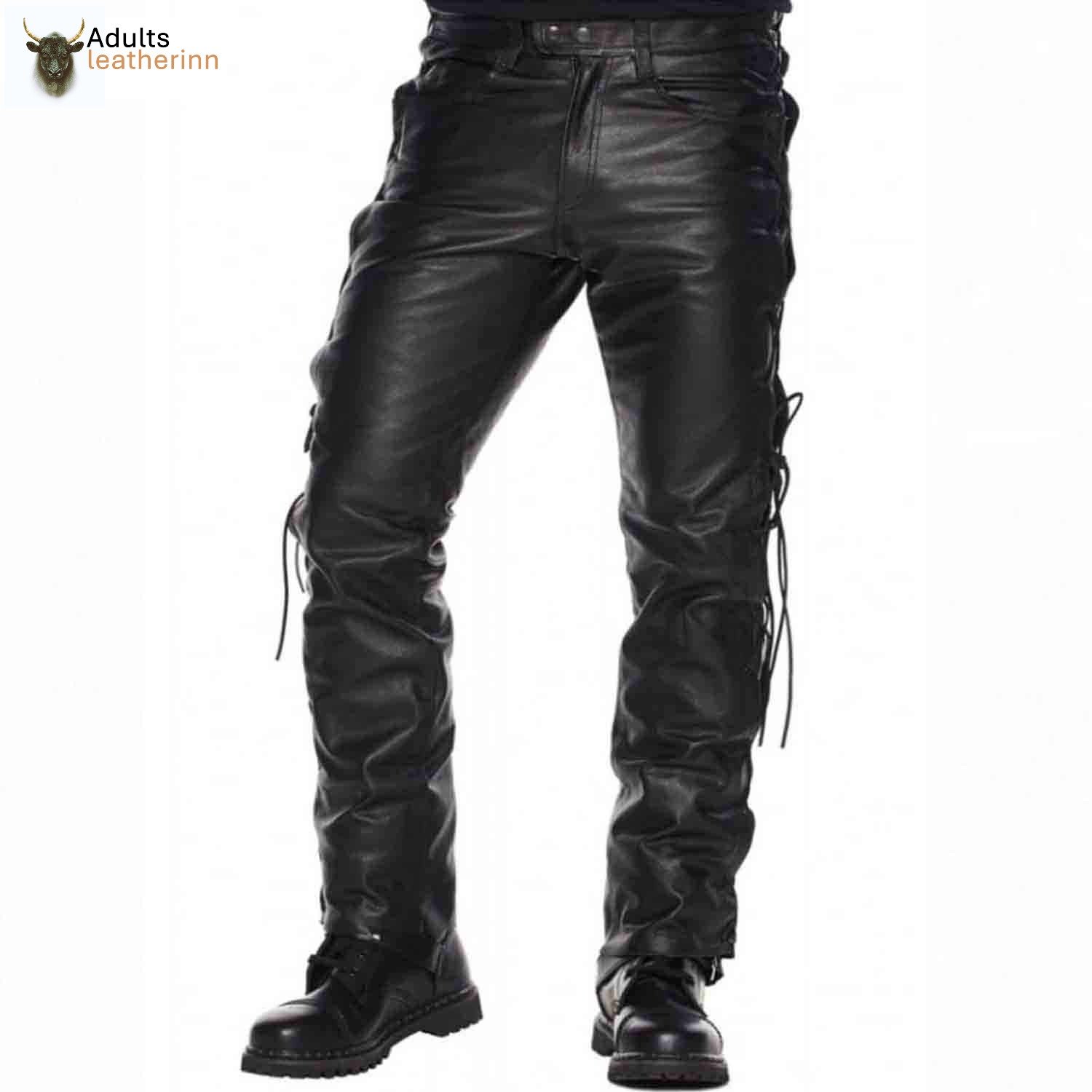 Mens Black Cowhide Leather Trousers Motorbike Motorcycle Lacing Pants Trousers Jeans