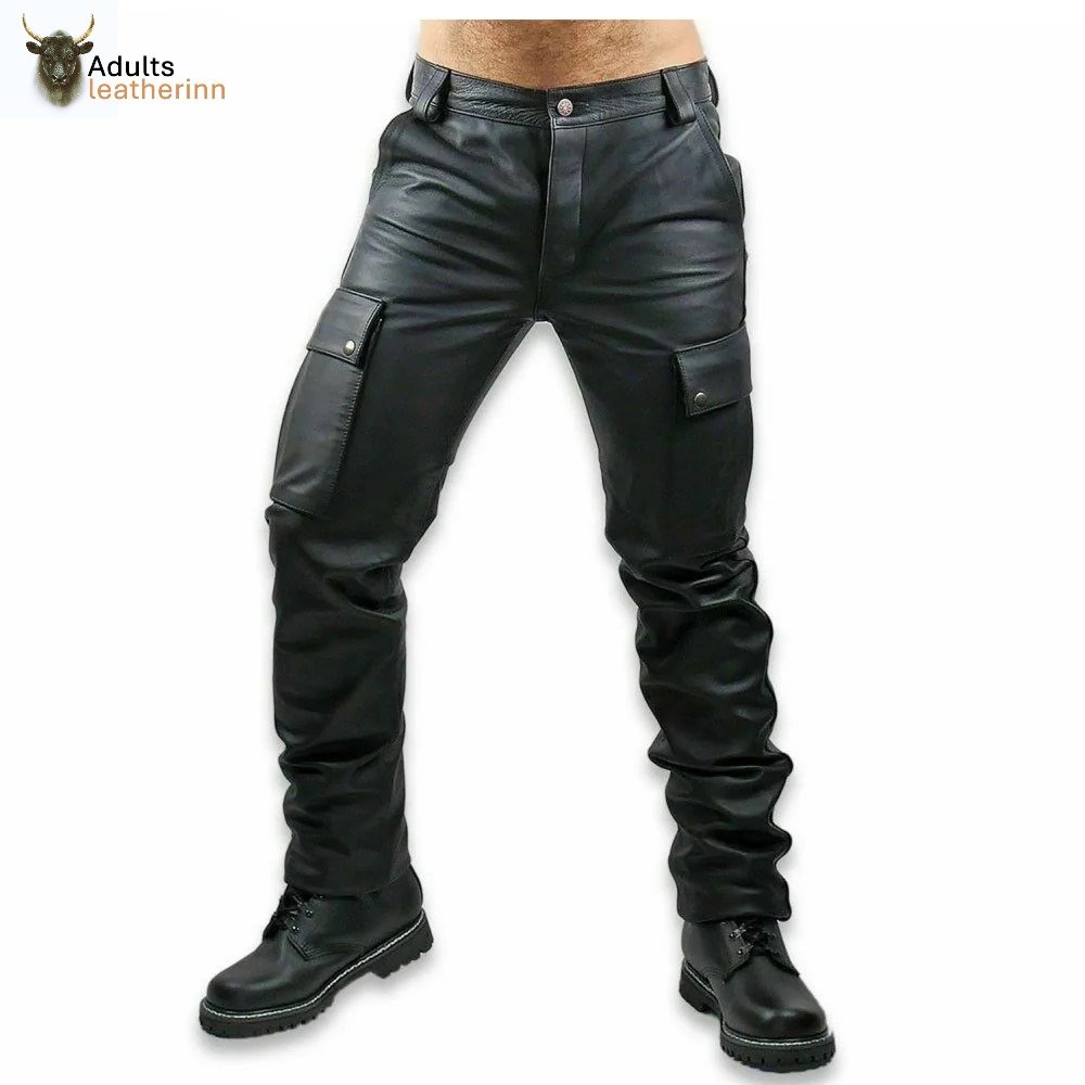 Mens Black Cowhide Soft and Plain Saddleback Cargo Leather Gay Pants Trousers