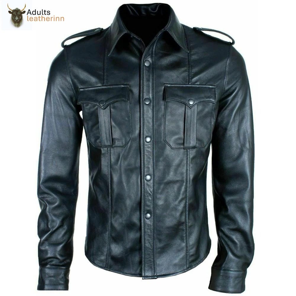 Mens Real Black Leather Police Military Style Shirt BLUF Full Sleeves Shirt